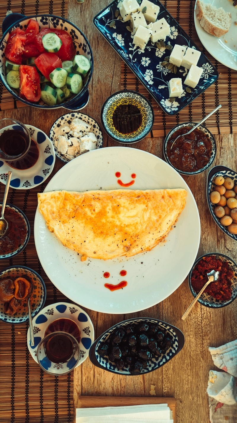 There's no better way to begin a sun-drenched day in Bodrum than with a traditional Turkish breakfast—a curated medley of local cheeses, olives, fresh tomatoes and cucumbers, free-range eggs, artisanal jams, and golden, crusty bread. Accompanied by endless glasses of Turkish tea served in delicate tulip-shaped glasses, breakfast here is not just a meal; it's a cultural ritual.